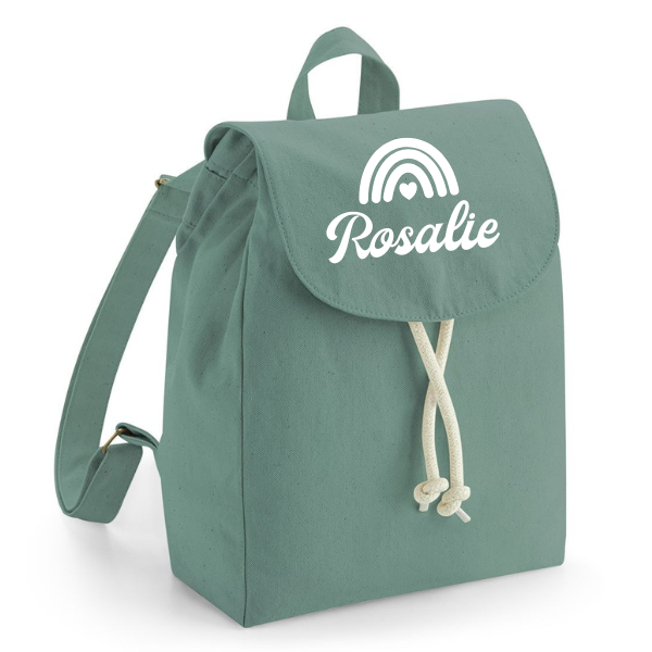 Découvrez ce mini sac à dos en coton bio personnalisé par flocage du prénom de votre choix et du joli motif « Arc en ciel ».