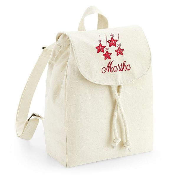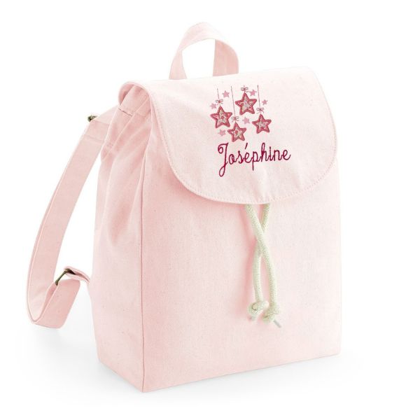 Découvrez ce mini sac à dos en coton bio brodé du joli motif « Etoiles suspendues » et du prénom de votre choix.