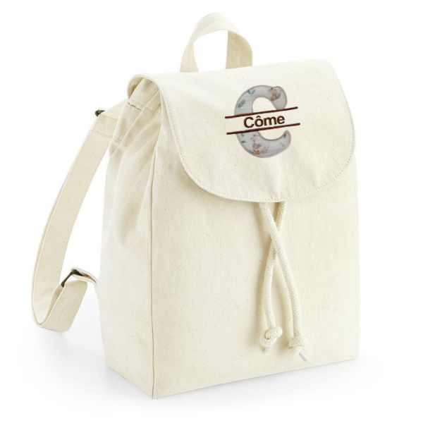 Découvrez ce mini sac à dos Naturel en coton bio brodé de l’initiale en appliqué et du prénom de votre choix au milieu.